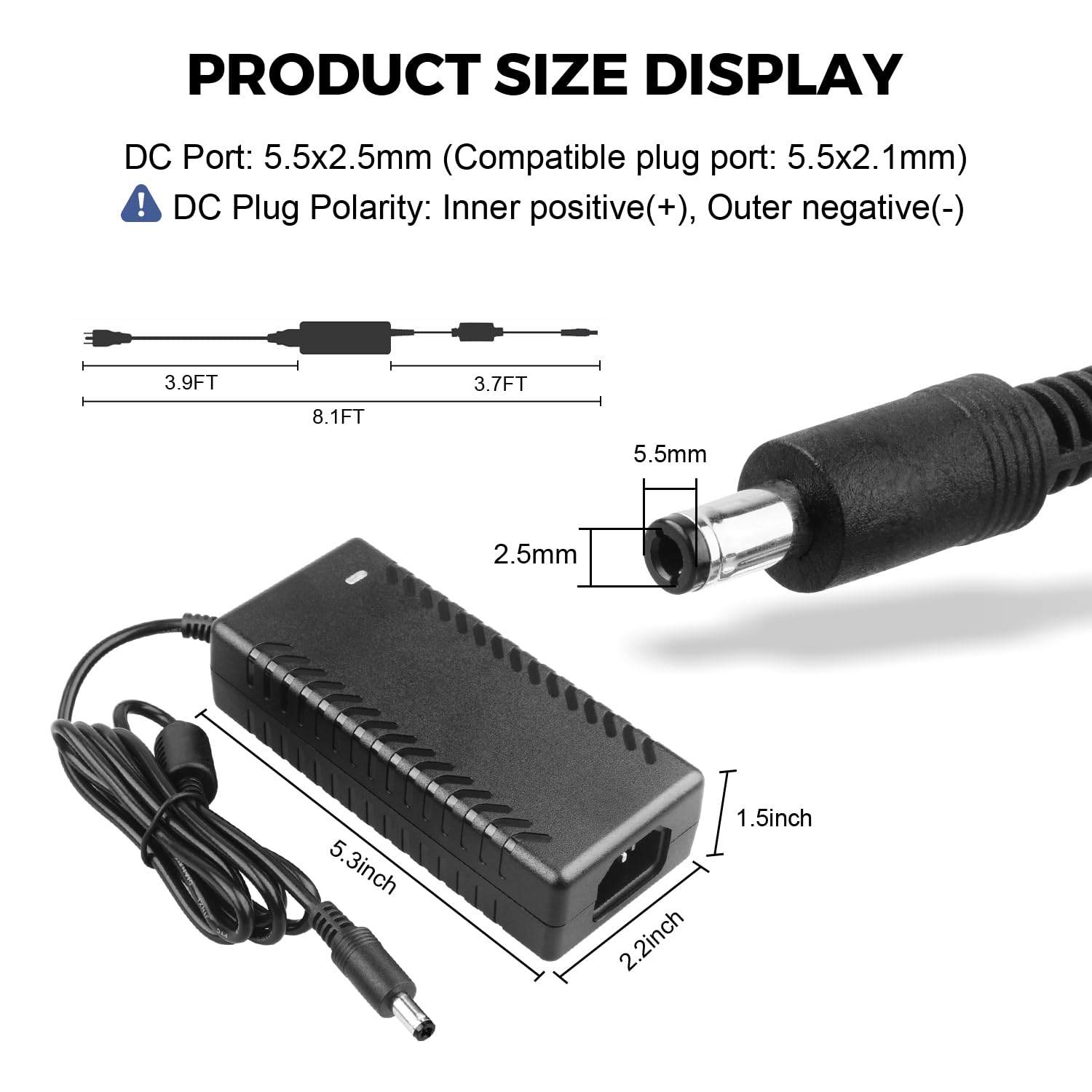 - 【Plug Design】– Fit for both 5.5×2.5mm & 5.5×2.1mm plug. This cable terminates with a “standard” 5.5mm OD, 2.5mm ID DC plug, but it’s also compatible with DC 5.5×2.1mm socket with the inner center spring contact. (NOTE: Power Supply Polarity: Center or Tip is positive (+), Sleeve is negative(-).