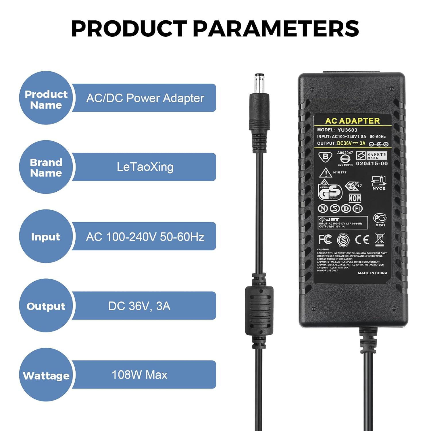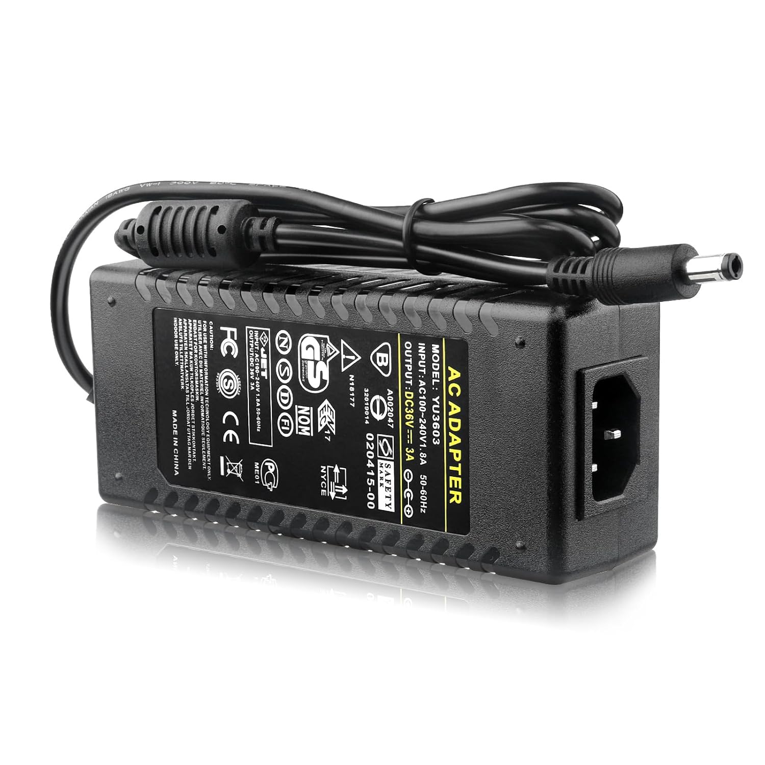 - 【Power Specifications】– Power Supply with Input AC100-240V- 50/60Hz and Output: DC 36V/3A (3000mA), 218cm (7.15 feet) Total Cable Length. Indoor use only!