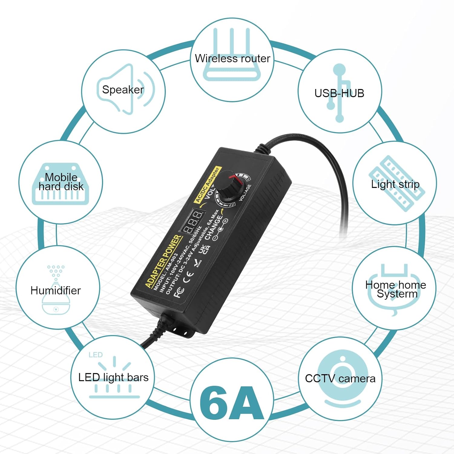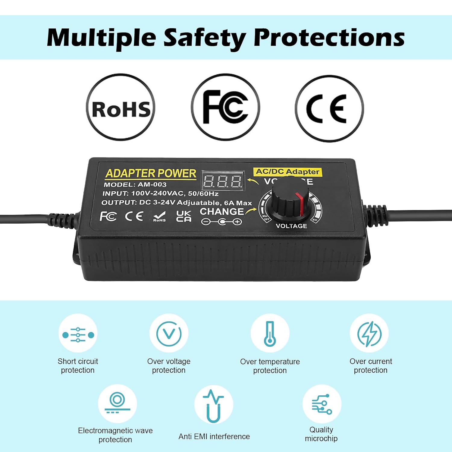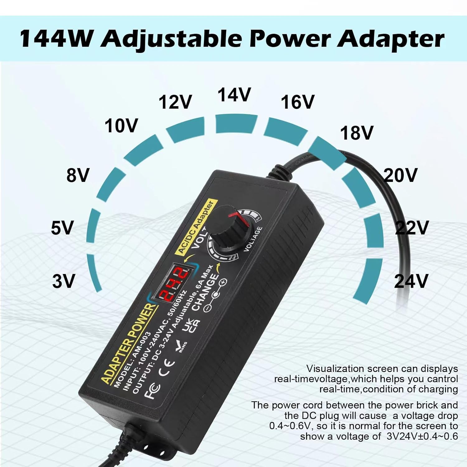 • 【Adjustable Power Supply】Input: AC 100~240V, 50/60Hz; Output: DC 3~24V Adjustable, Max 6A, 144W. The variable voltage is easy to select. You can easily obtain the voltage you want by turning the button, such as 3V 3.5V 4V 4.5V 5V 6V 7.5V 9V 12V 15V 18V 19V 20V 24V. The voltage should not exceed 6A, otherwise the power supply will be damaged.